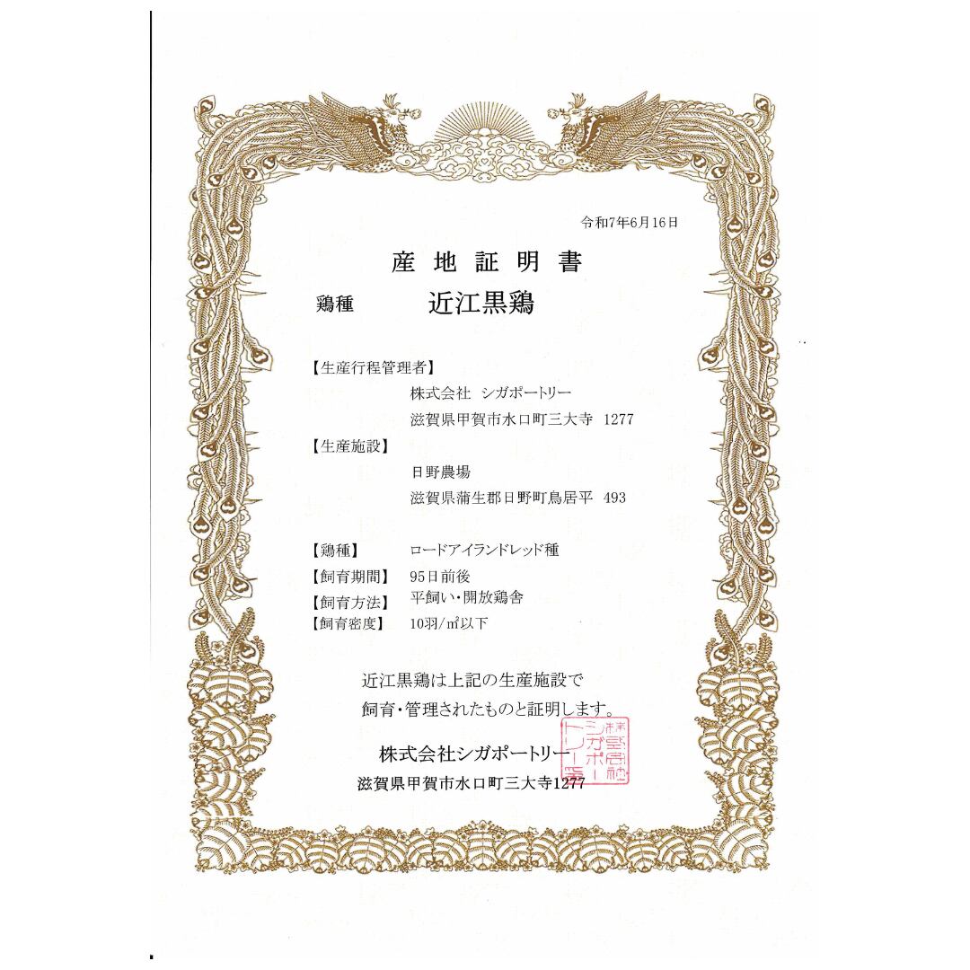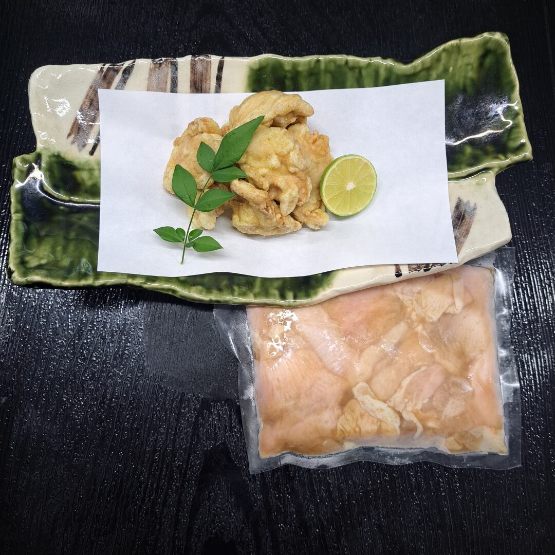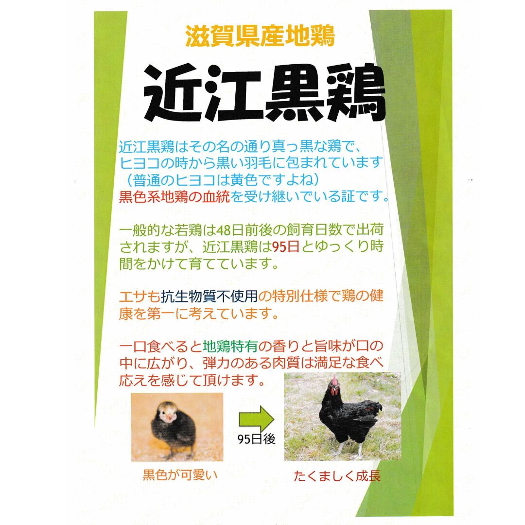 賞味期限:1ヶ月(未開封・未解凍)/原材料名:近江黒鶏・むね肉、醬油、にんにく、玉ねぎ、砂糖、酵母/調味料、酸化防止剤、香辛料(一部に小麦・大豆を含む)/調理方法:冷蔵庫で約1日解凍、キッチンペーパーなどで、余分な水気を取り除く、小麦粉で打ち粉をして、てんぷら粉を付けて165℃~180℃の温度で3分~4分揚げる